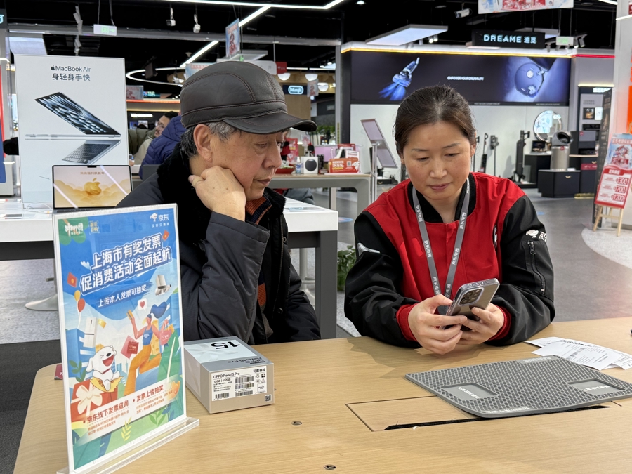 如今,“有奖发票”活动即将满月,参与情况如何?记者昨天走访了位于中环百联购物中心的京东电器,70多岁的董老伯正在这里买手机,收获了“国补摇号+有奖发票”双重惊喜。